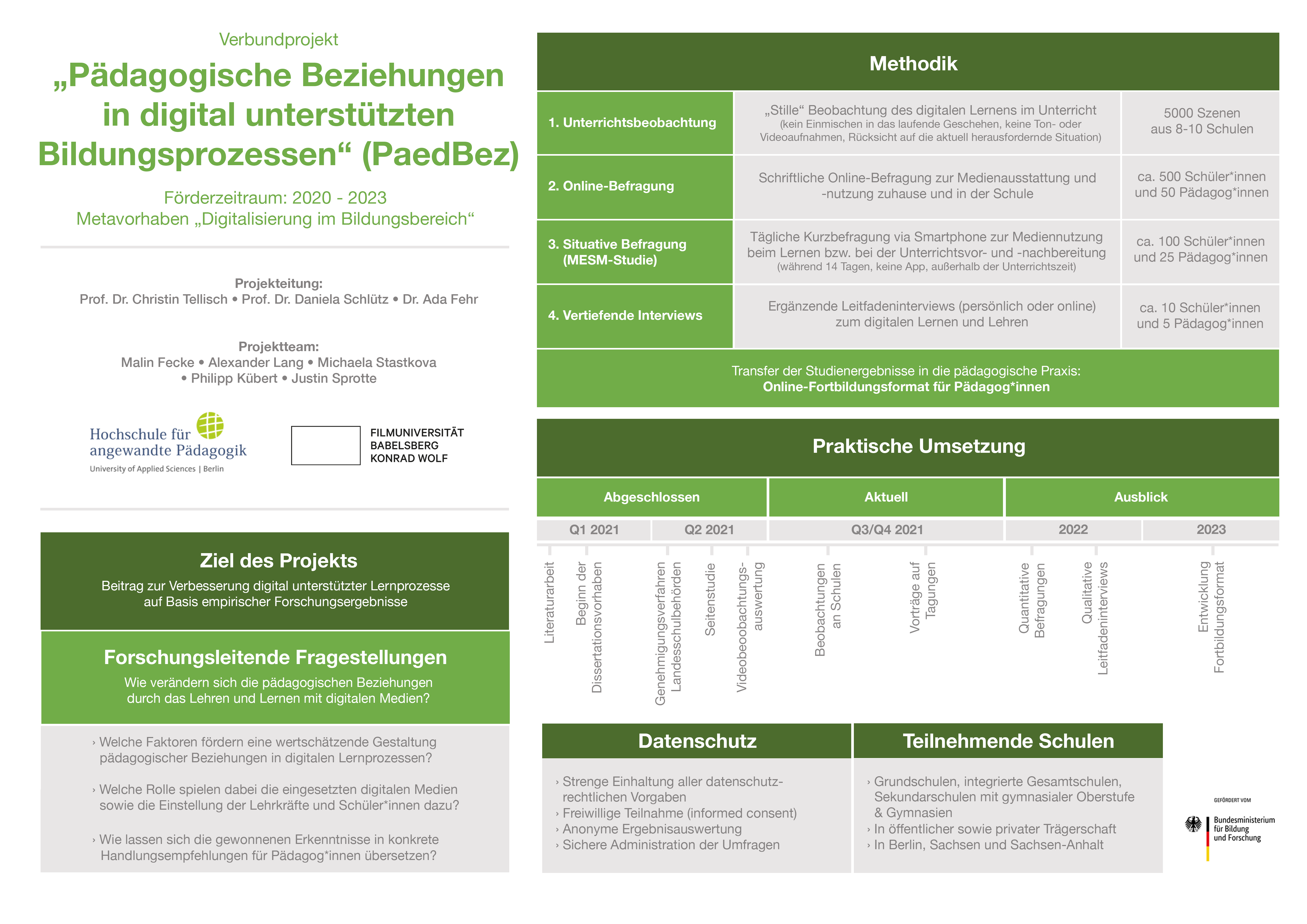 Das Forschungsprojekt PaedBez ist ein Verbundprojekt der Hochschule für Soziale Arbeit und Pädagogik (HSAP) in Berlin und der Filmuniversität Babelsberg KONRAD Wolf in Potsdam. Geleitet wird es von Prof. Dr. Christin Tellisch (HSAP) sowie von Prof. Dr. Daniela Schlütz (Filmuniversität). Projektkoordinatorin ist Dr. Ada Fehr (Filmuniversität).